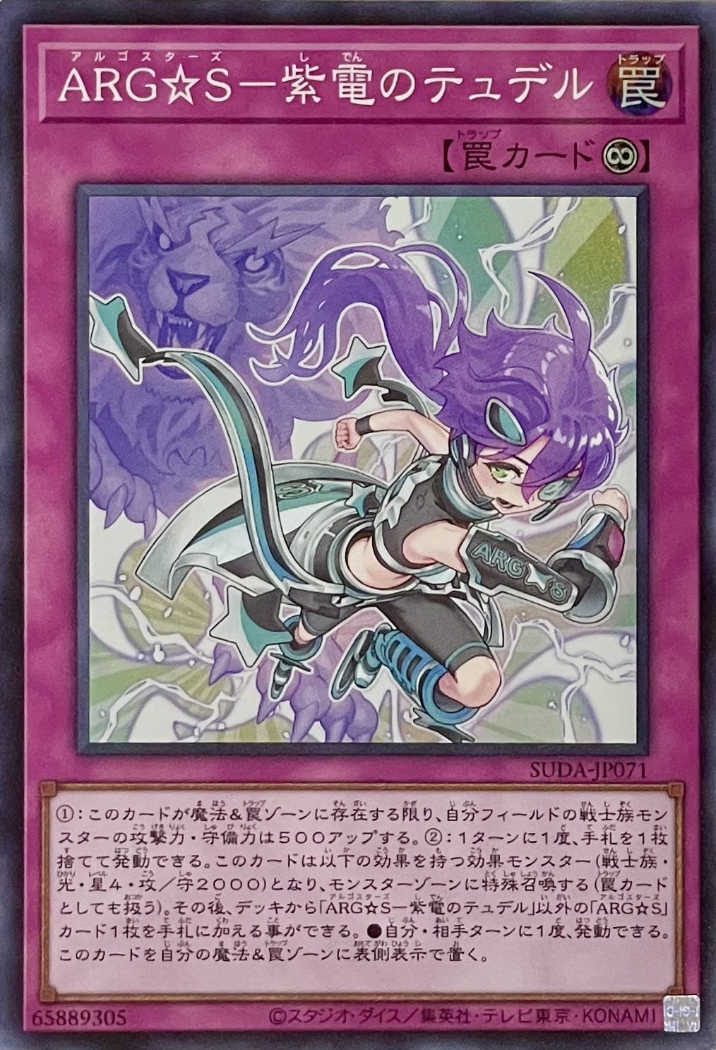 (2):1ターンに1度、手札を1枚捨てて発動できる。このカードは以下の効果を持つ効果モンスター(戦士族・光・星4・攻/守2000)となり、モンスターゾーンに特殊召喚する(罠カードとしても扱う)。その後、デッキから「ARG☆S-紫電のテュデル」以外の「ARG☆S」カード1枚を手札に加える事ができる。